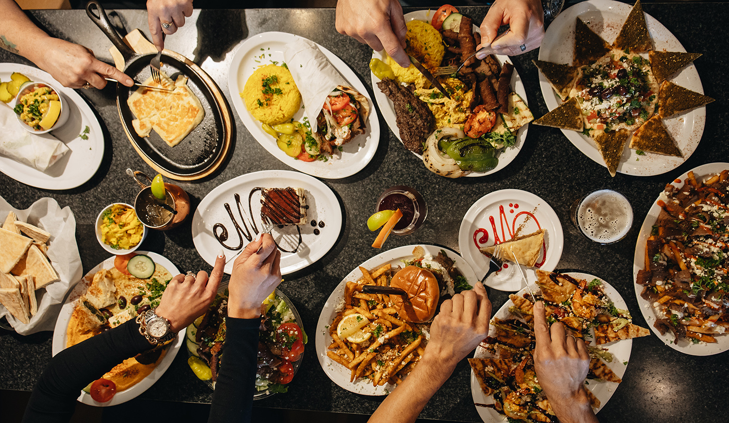 We have been family owned and operated since 1995. My father (George Sr.), My mother (Joan), My Sister (Elizabeth) and my wife (Alicia) and me (George Jr.), are involved in the day to day operations. My family's background is Chaldean. We are one of the oldest surviving people from the ancient world are history dates back over 6000 B.C. our people originated in Mesopotamia which is now modern day Iraq. My father speaks, reads & writes Aramaic which is the ancient language that Abraham from biblical times spoke. I am the first generation in my family to be born in the GREAT US of A! I hail from Detroit, MI where I was born and raised. We moved out to phoenix in the 90's and have been doing the restaurant business ever since. We offer cuisine from quite a few areas of the Mediterranean. You will see both Greek and mid eastern influence since my father's background is from the mid east and he also lived in Greece. With my love for Mediterranean cuisine I have found inspiration for our cuisine from many cultures including, Lebanese, Greek, Israeli, Moroccan, Iraqi, Italian and even American & South Western fusion. Come in and say hello and grab a bite of some of our home cooked food. You will join the many regulars that have become part of our extended family. Don't Forget to try the Saganaki (Flaming Cheese) OPA!!!!!
